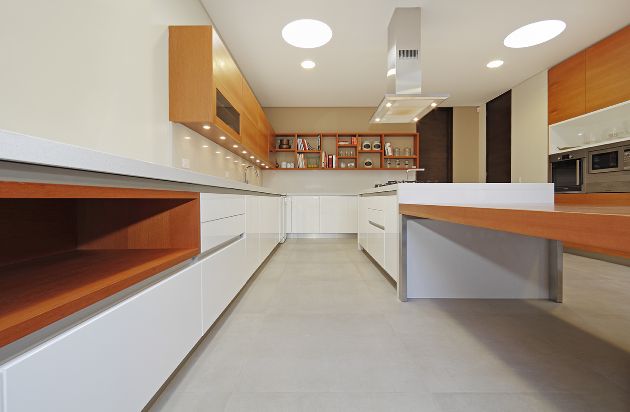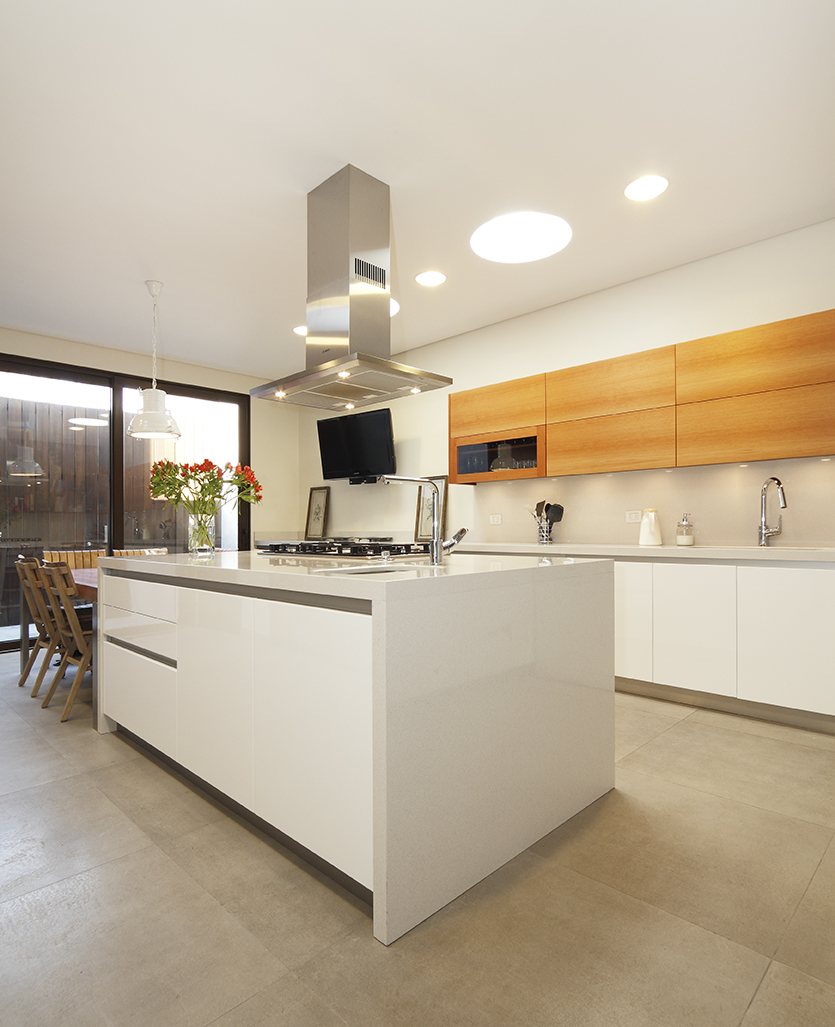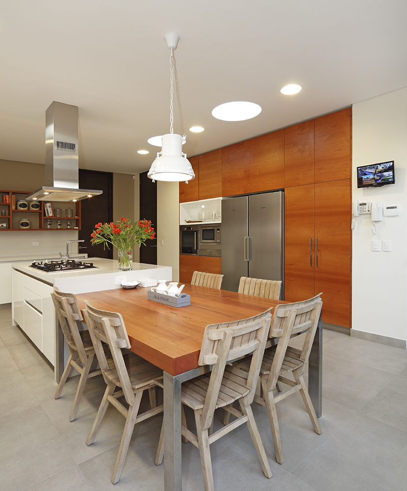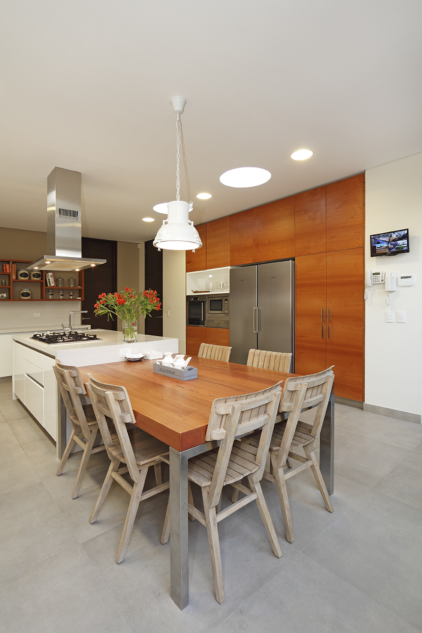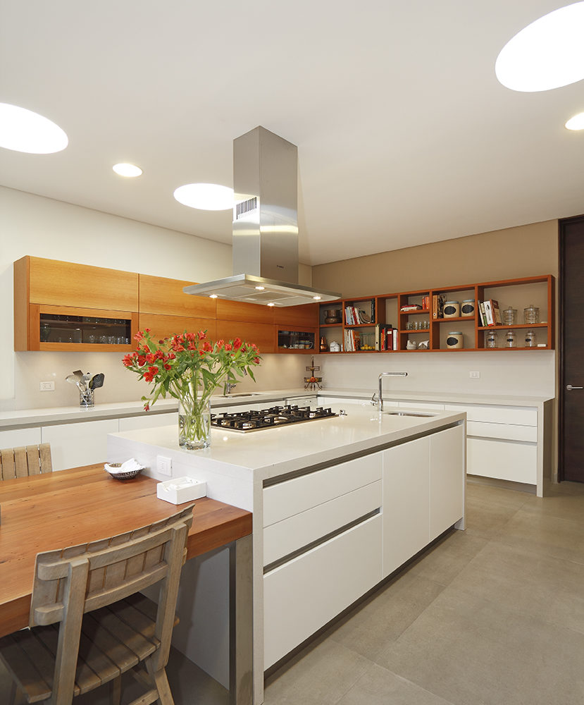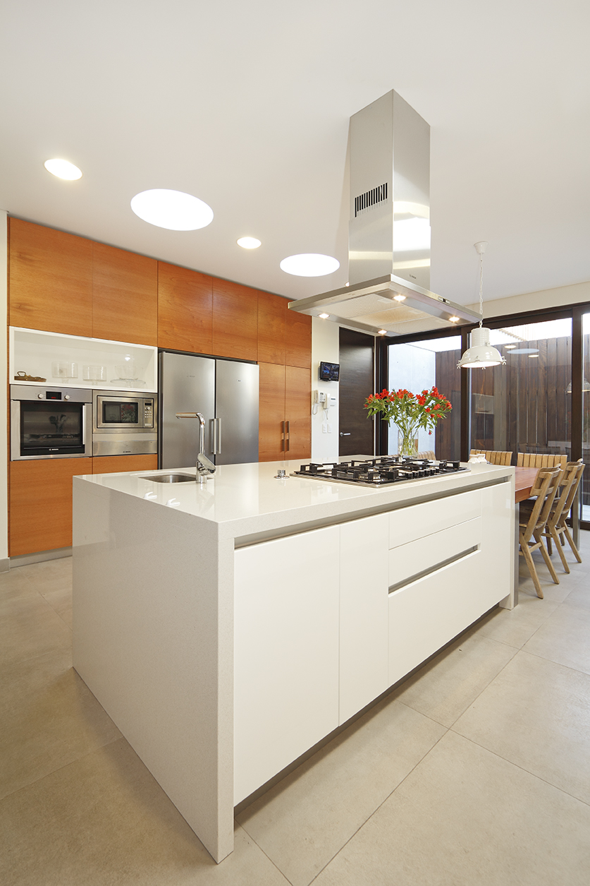 Isla central para cocinar con mesa comedor de diario. Muebles de apoyo distribuidos en L y muro con columnas de artefactos al frente. Frentes lacados poliuretano blanco brillante. Tirador corrido perfil aluminio. Cubierta cuarzo Silestone Blanco Zeus.